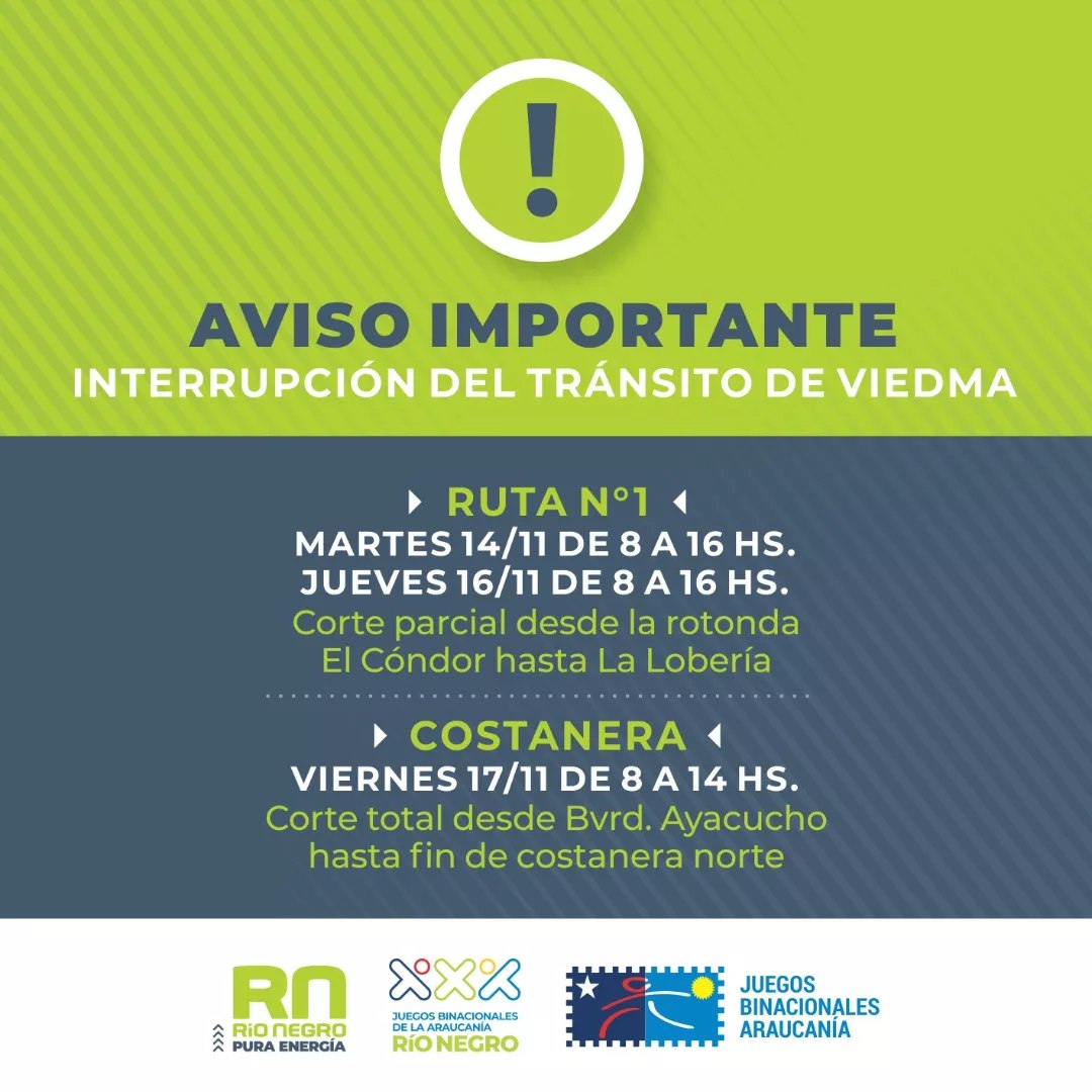 La Secretaría de Deporte informa que desde el 13 al 17 de noviembre se estarán desarrollando los Juegos Binacionales de la Araucanía, y para la disciplina de ciclismo se requerirá la interrupción del tránsito (parcial o total) en algunas zonas de Viedma y alrededores.