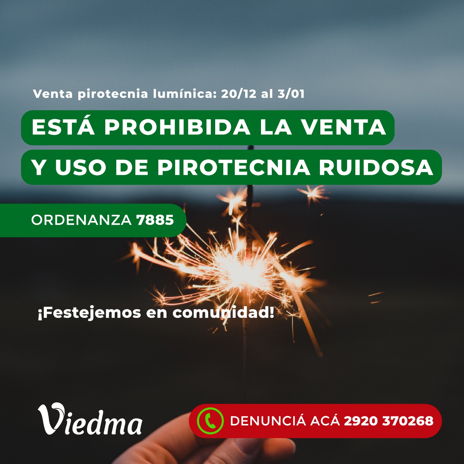 Desde el área de Protección Ciudadana se recuerda que las denuncias por venta ilegal de pirotecnia pueden realizarse al número 2920-370268 o en las oficinas de Protección Ciudadana, ubicadas en calle Brown y Belgrano.