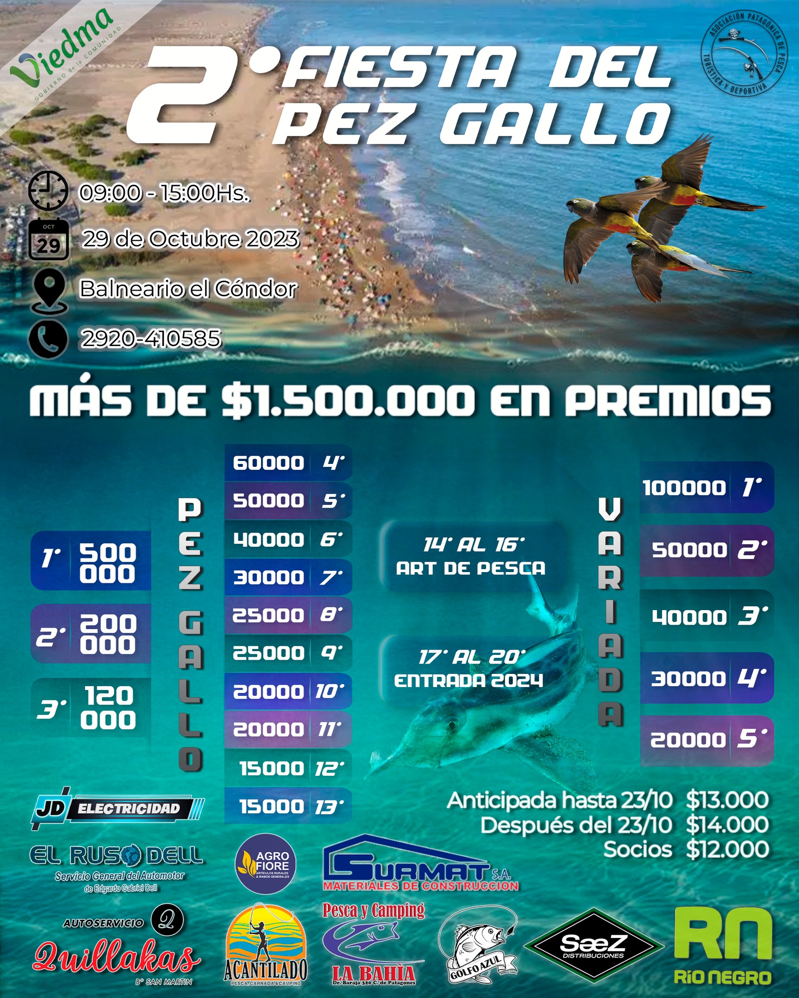 Premios al gallo de mayor peso hasta el puesto 20°. Variada de mayor peso hasta el 5° puesto. Sorteos y muchas sorpresas más! Entradas disponibles en Pesca Y Camping La Bahia, Pescaderia Golfo Azul y Acantilado Pesca. Los esperamos a todos.