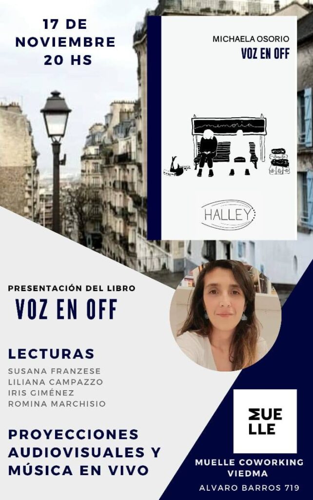 El viernes 17 de noviembre a las 20hs en Muelle Coworking (Alvaro Barros 719) se presentará el libro «VOZ EN OFF» un poemario de la escritora Michaela Osorio, que reúne las voces de quiénes ya no están. Una familia determinada por un exilio, la muerte de un hijo y la vida renaciendo en la tempestad.