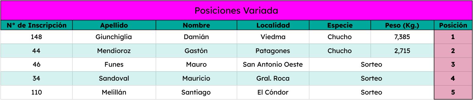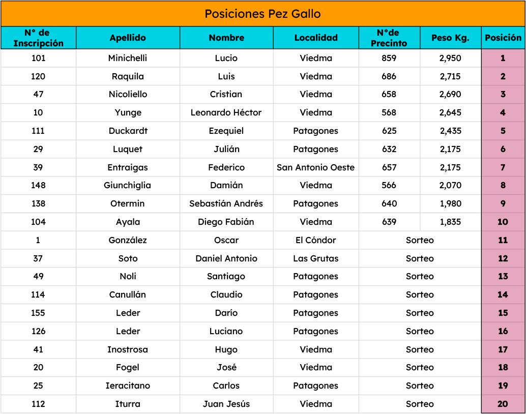 El Pez Gallo fue premiado hasta el puesto N°20, mientras que la Variada hasta el 5to puesto.