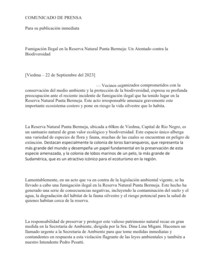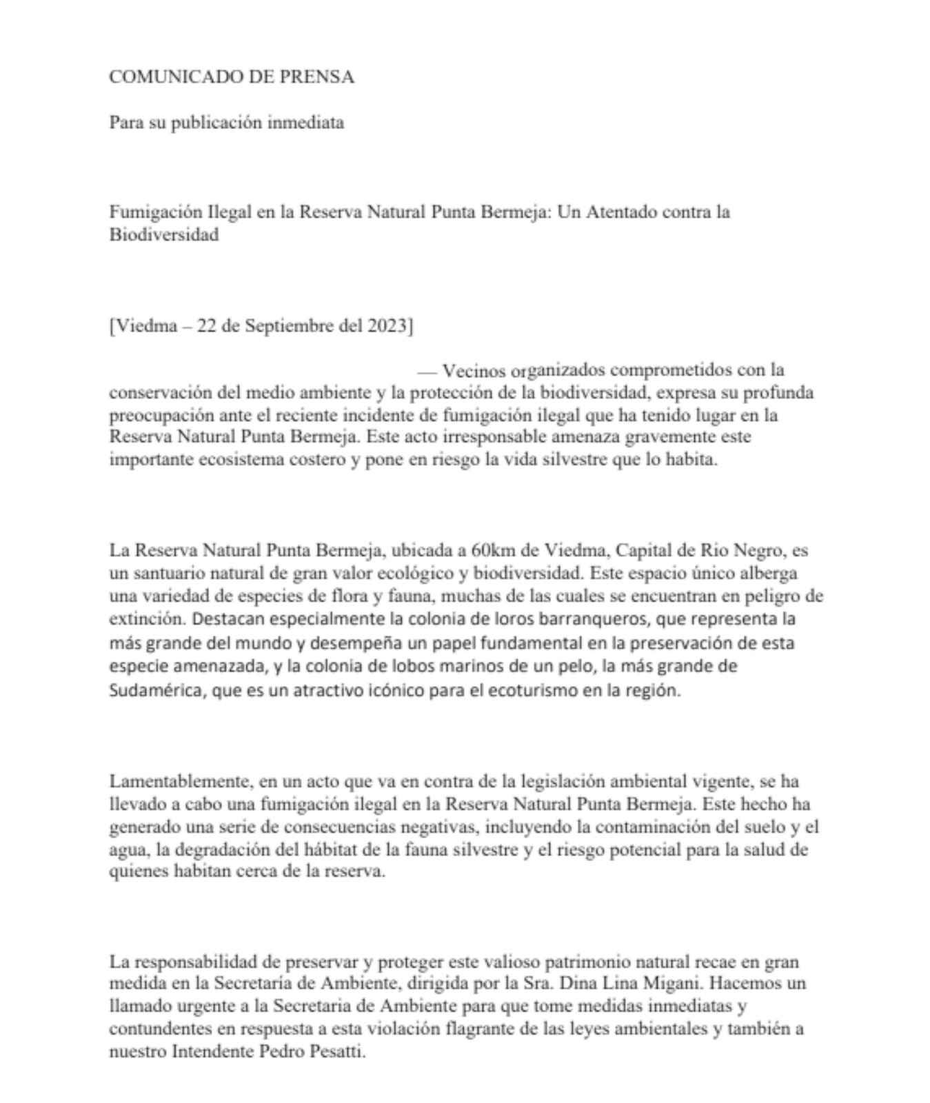 22 de septiembre de 2023 – Un grupo de vecinos organizados de Viedma expresaron su profunda preocupación por la fumigación ilegal que se llevó a cabo en la Reserva Natural Punta Bermeja, ubicada a 60 kilómetros de la ciudad.
